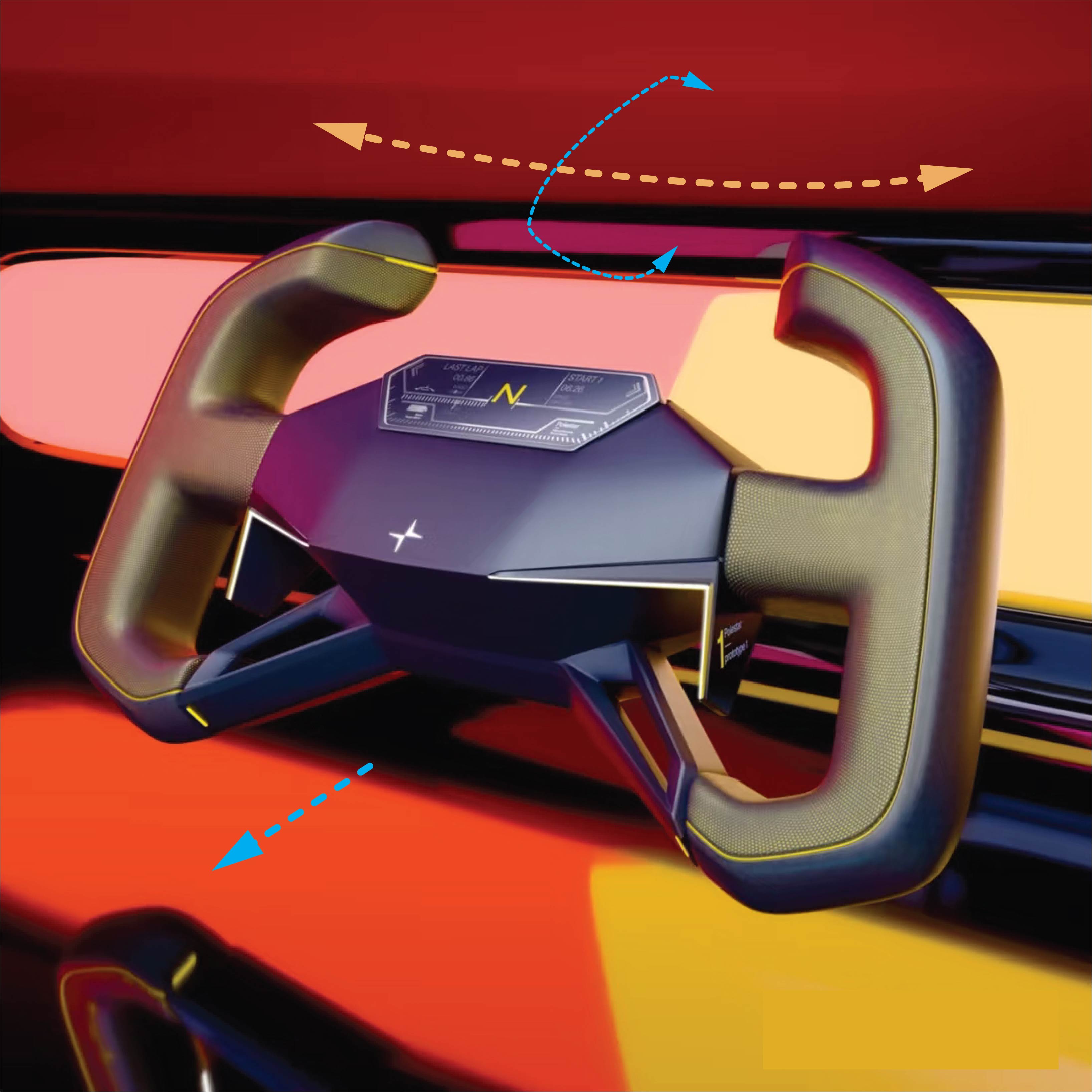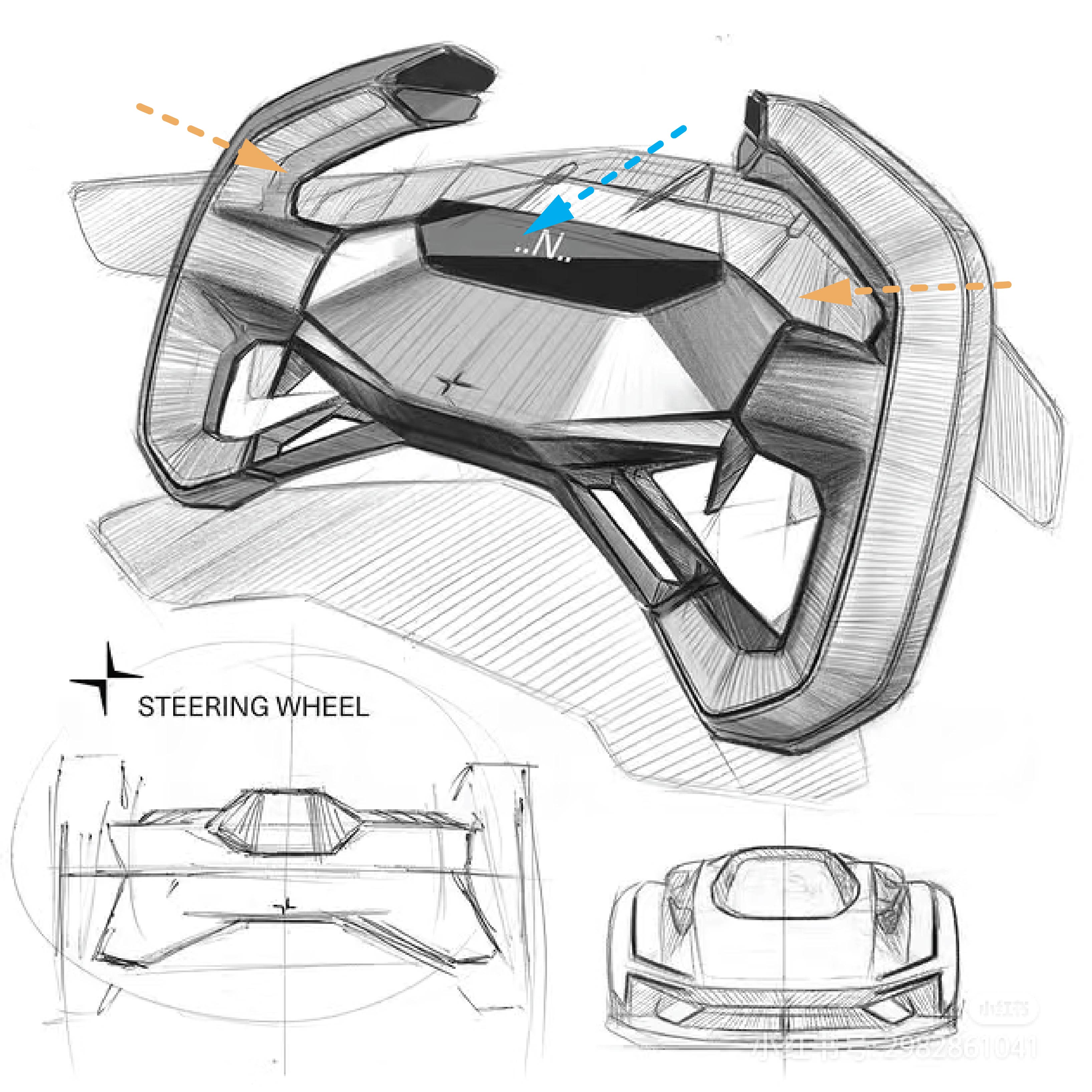 Be aware there’re changes from sketch to renderings. The central geometry poked outward, emphasizing dominance and presence.The soft visual on grips indicate a dominant, substantial hold.